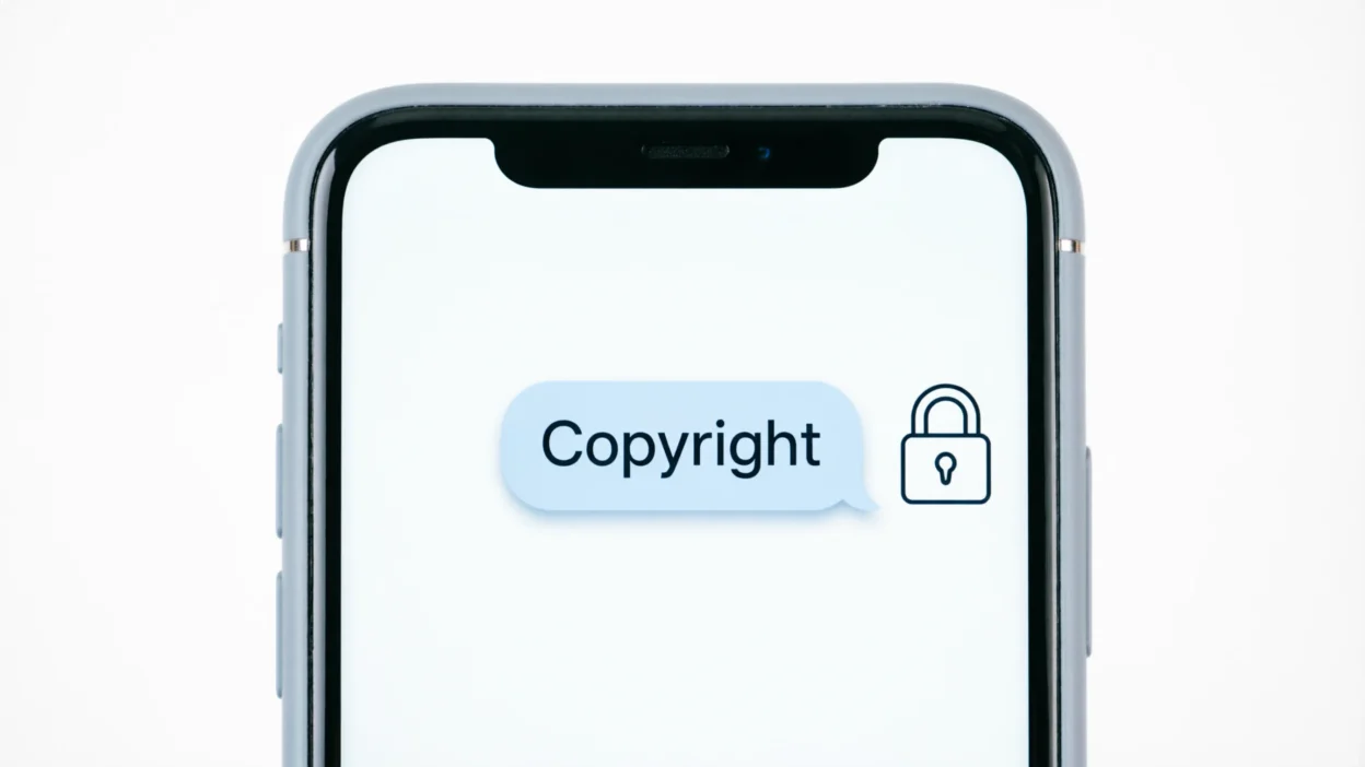 “A simple digital illustration showing a smartphone chat screen with the word ‘Copyright’ and a lock symbol protecting photos, clean social media style, bright background, simple and clear for blog feature image”